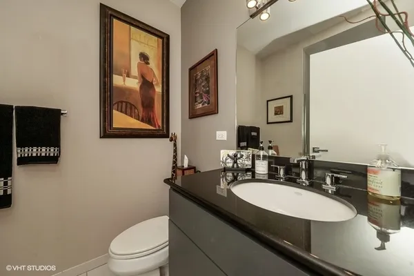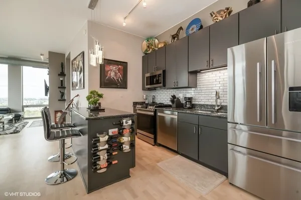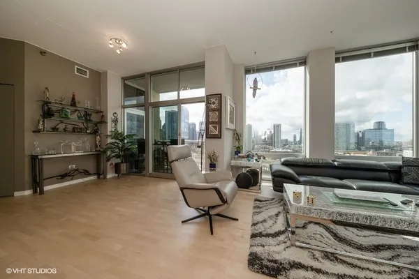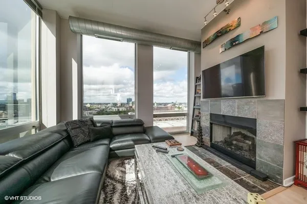 Stunning, sun-drenched southwest corner 2 bedroom / 2 bathroom plus den residence in River Place on the Park, one of River North's most desirable full-amenity buildings. This premier-tier home offers unobstructed south and west views overlooking the Chicago River, Montgomery Ward Park, and the city skyline-truly spectacular from every room. Floor-to-ceiling windows flood the home with natural light and open to a walk-out balcony from the living room, perfect for taking in the breathtaking skyline, river, and park views. The open-concept layout features hardwood floors throughout, a split-bedroom floor plan with both bedrooms fully enclosed, and a bonus den ideal for a home office. The kitchen is beautifully appointed with stainless steel appliances, 42" cabinetry, granite countertops, custom tile backsplash, a built-in pantry, and an oversized island with breakfast bar. The living area includes a gas fireplace and dedicated dining space, creating a comfortable and functional entertaining layout. The spacious primary suite offers two closets, including a professionally organized walk-in, and a spa-like bath with dual vanity, soaking tub, and separate shower. The home has been freshly painted and thoughtfully updated throughout. River Place on the Park is a full-amenity building featuring a 24-hour door staff, on-site property manager, fitness center, and beautifully maintained common areas. Unbeatable location steps to the Riverwalk, dog park, playgrounds, Erie Cafe, East Bank Club, Starbucks, public transportation, and easy access to I-90/94. Two heated garage parking spaces and storage included. A rare opportunity to own a turnkey corner home with iconic Chicago views in one of River North's best locations.